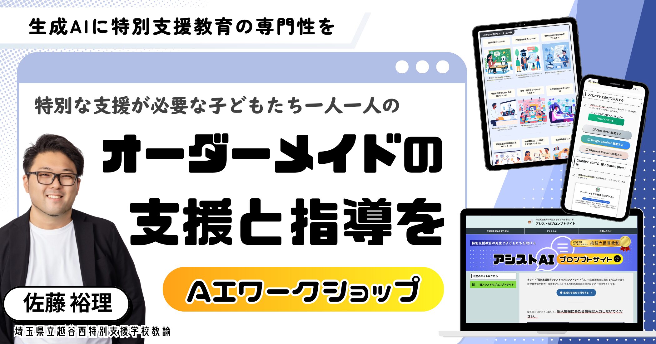 「アシスト AIプロンプトサイト」では、各種生成AIでそのまま使える、特別支援教育に特化したプロンプトを公開しています。 これらのプロンプトを活用することで、学習や生活上の課題が一人ひとり異なる子どもたちに対し、最適な支援策や授業展開の助言を得ることができます。 本ワークショップでは、AIとの対話を通じて、目の前の子どもたちへの具体的な支援方針を導き出すプロセスを実際に体験いただけます。