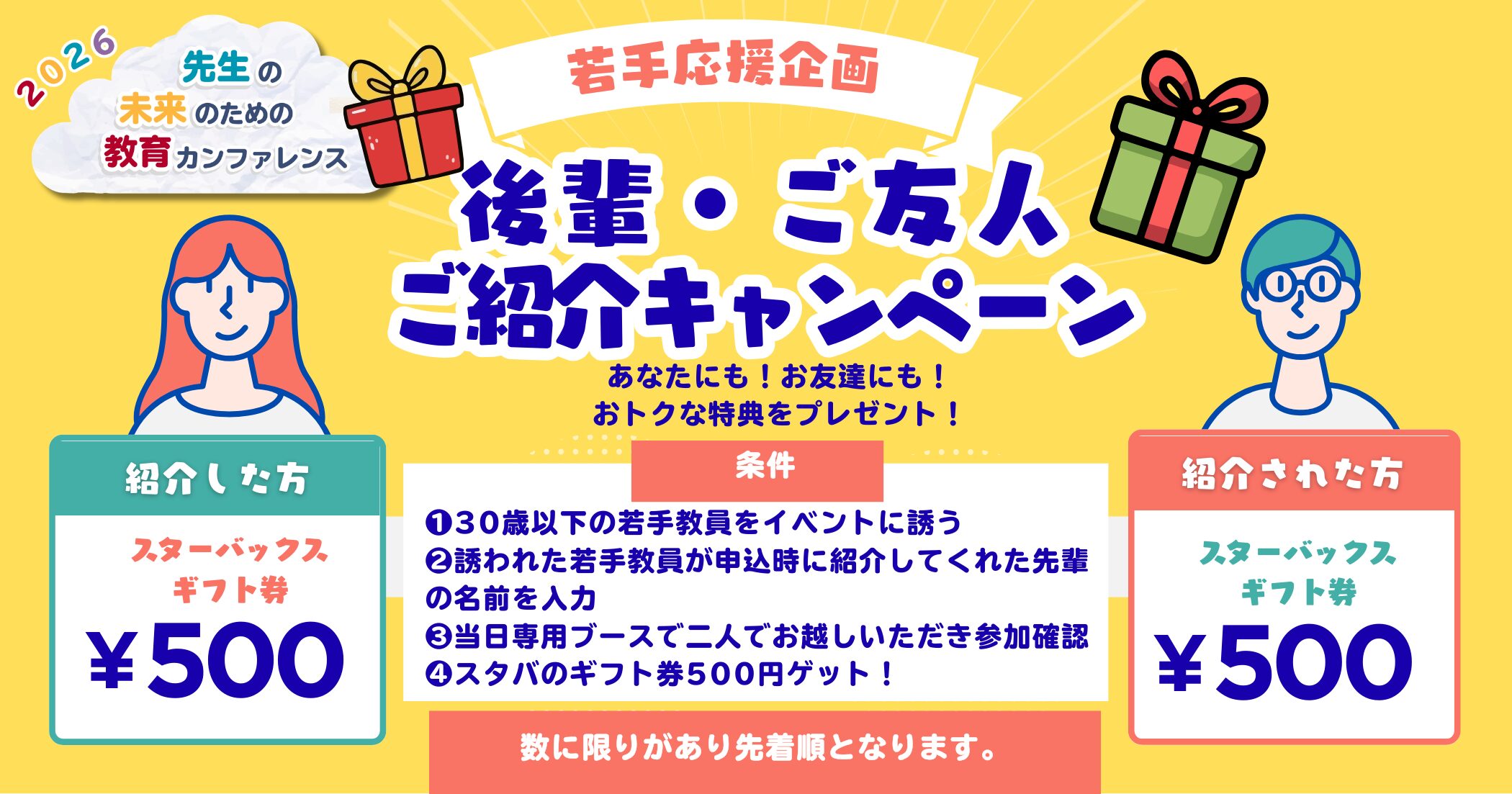 職場の若手の先生をイベントに誘い、条件をクリアするとスターバックスギフト券500円分を双方にプレゼントします!